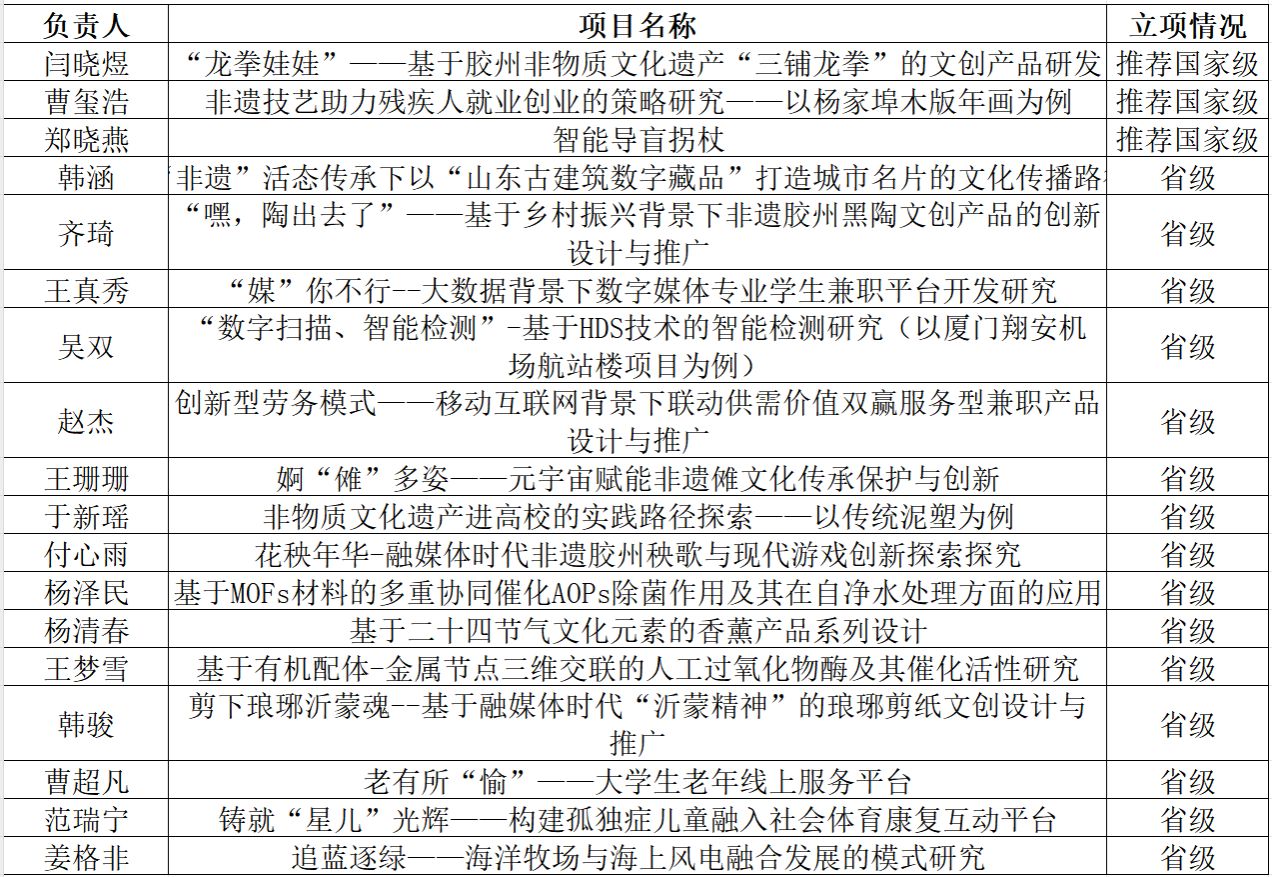 近日,山东省教育厅对2024年省级大学生创新创业训练计划项目拟立项名单进行公示,我校共18个项目拟省级立项,其中3个项目拟推荐国家级立项。