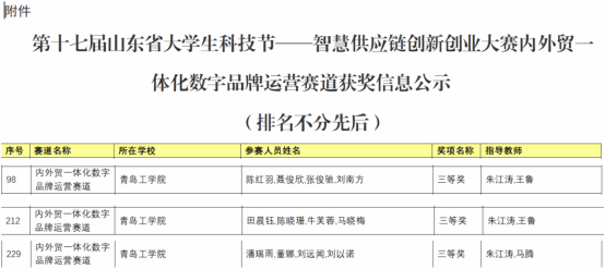近日,在第十七届山东省大学生科技节智慧供应链创新创业大赛 -内外贸一体化数字品牌运营赛道上,青岛工学院经济管理学院三支队伍勇战群雄!最终,三支队伍全部脱颖而出,均荣获三等奖,用实力书写荣耀篇章!