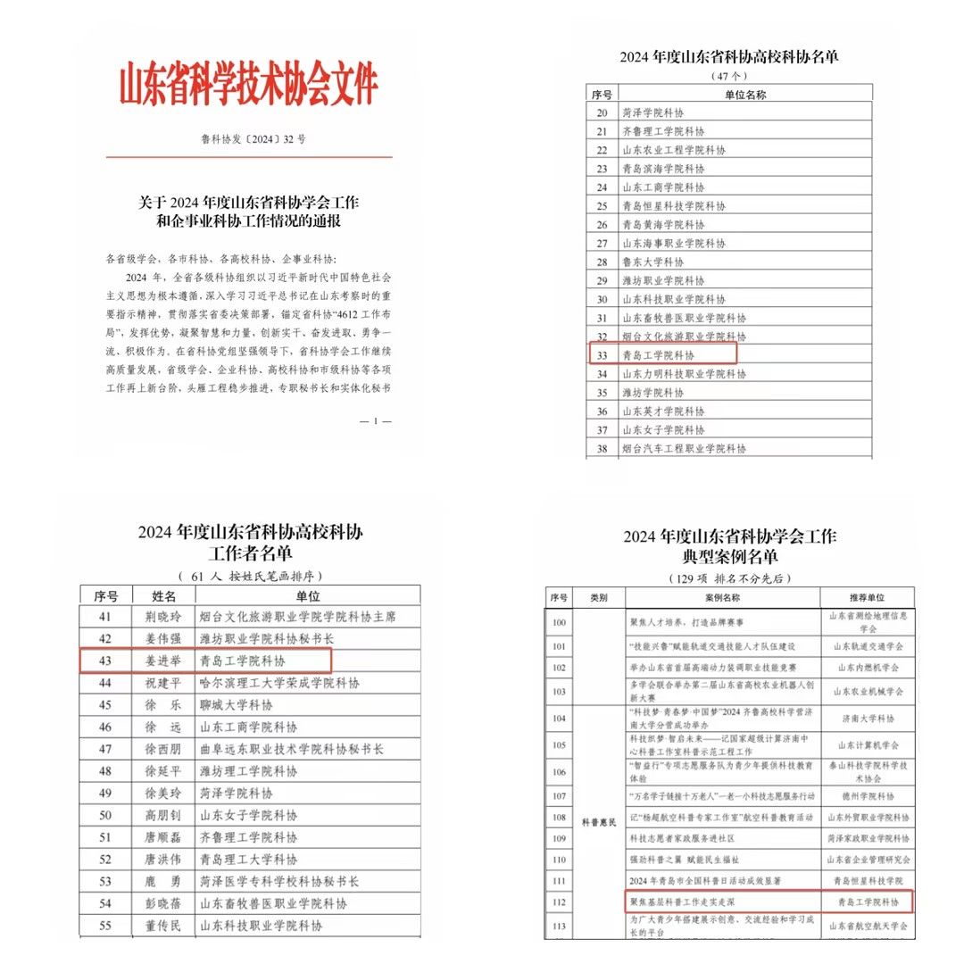 近日,山东省科学技术协会印发《关于2024年度山东省科协学会工作和企事业科协工作情况的通报》(鲁科协发〔2024〕32 号),青岛工学院科协入选“2024年度山东省高校科协”表彰名单;青岛工学院食品工程学院姜进举博士入选“2024年度山东省科协高校科协工作者”表彰名单;《聚焦基层科普工作走实走深》案例入选“2024年度山东省科协学会工作典型案例”表彰名单。